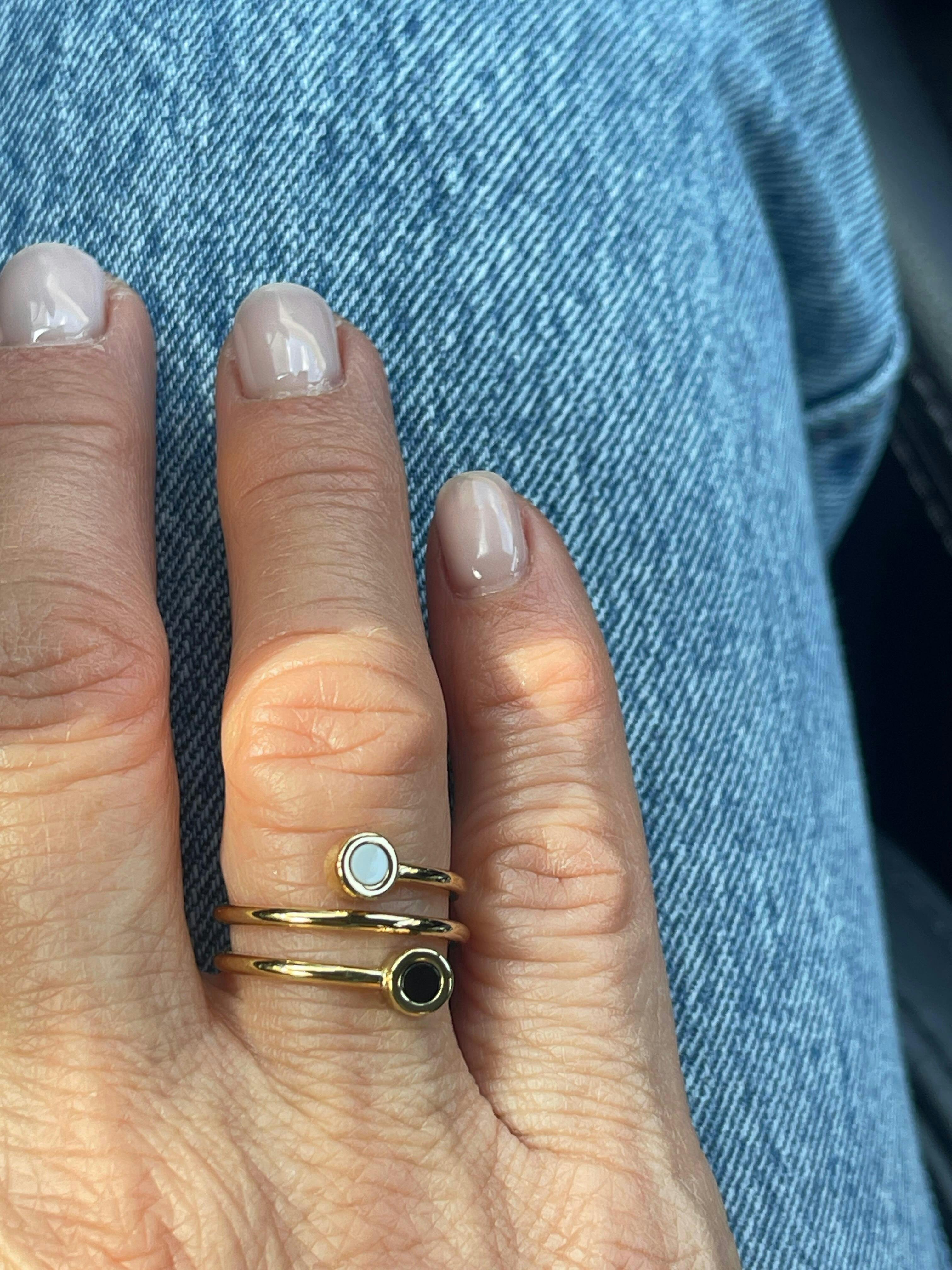 Make a sustainable statement with the Jason Hyde New Wave Double Ring. Crafted from stainless steel and plated in 18K gold, this unique double-band ring features two minimalist charms (0.5 cm each) made from recycled ocean plastic, certified by #tide ocean material, adding an eco-conscious touch to your look.